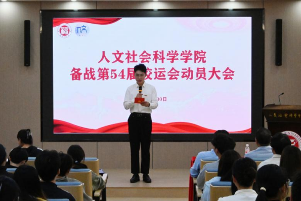 于学院213报告厅举行第54届校运会动员大会,学院党委副书记赵燕松,团委书记齐朝阳,辅导员黄薇、陈天龙出席大会,学院团委、学生会、研究生会骨干,各班体育委员和全体运动员代表参加本次大会。大会由2024级研究生王淏同学主持。