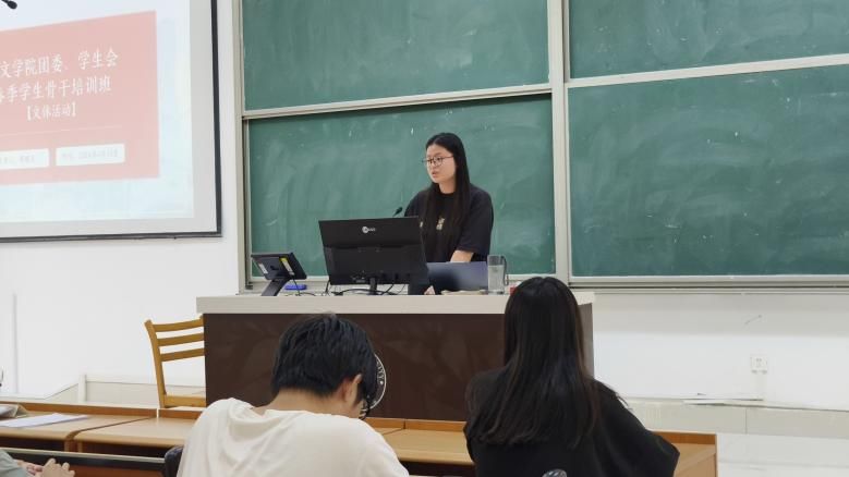 艺术团团长蔡堰灵作文体活动培训,分前期准备、中期把控、后期总结三部分说明,并阐明文体活动报账、活动宣传、奖励发布等注意事项。