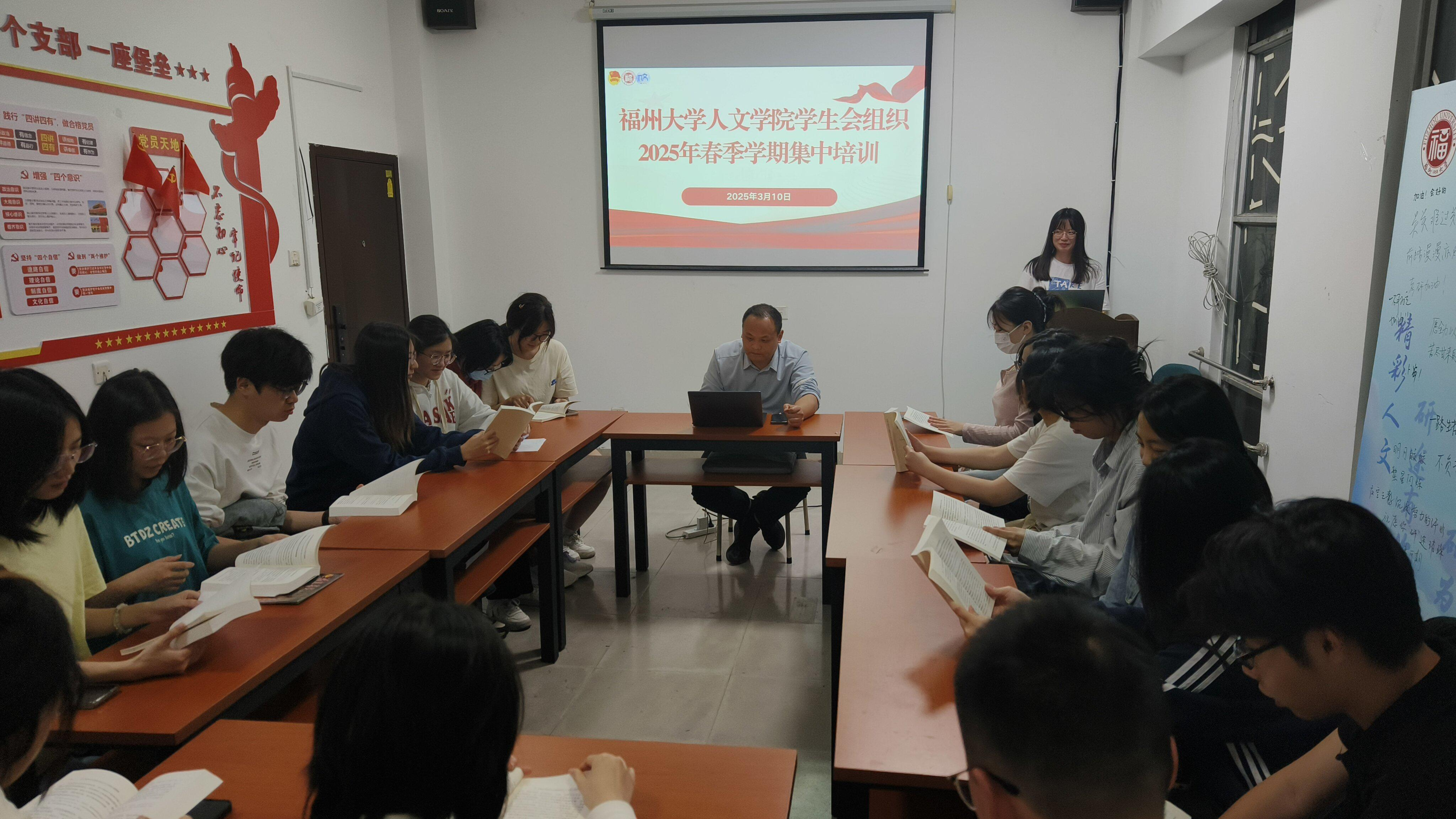 学生骨干于23号楼1楼活动室参与春季学期集中培训,院团委书记齐朝阳作《悟思想 强素质 提能力 促发展》主题讲授,并组织学生们共读经典。