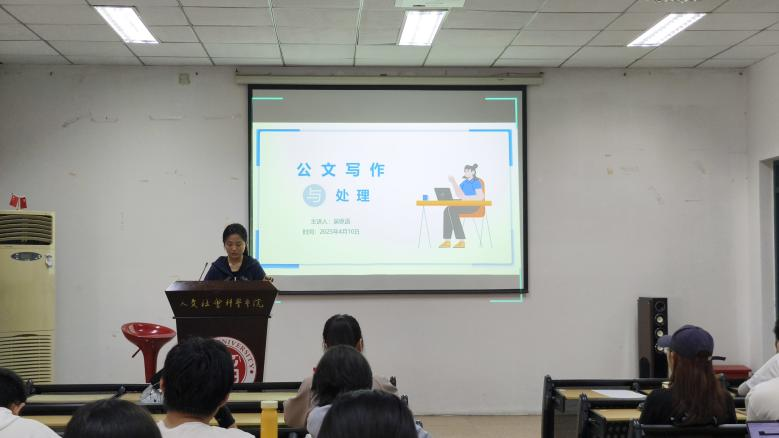 党务服务中心主任吴思语讲解公文写作技巧。她介绍公文的定义、种类和格式,强调准确、简洁、庄重、严谨、平实、规范的写作原则,并提示公文处理细则。