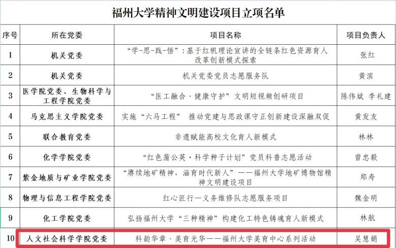 组织申报、院长吴慧娟教授负责主持的《科韵华章·美育光华——福州大学美育中心系列活动》项目成功入选福州大学精神文明建设项目立项名单,充分展现了博彩平台大全